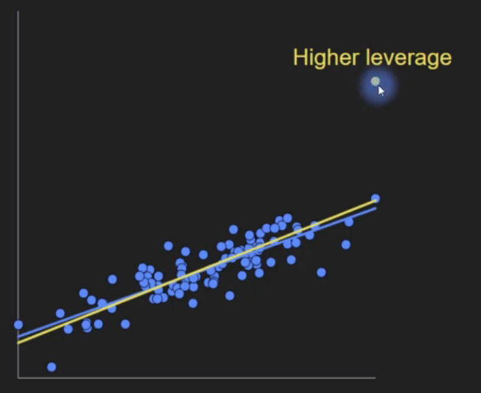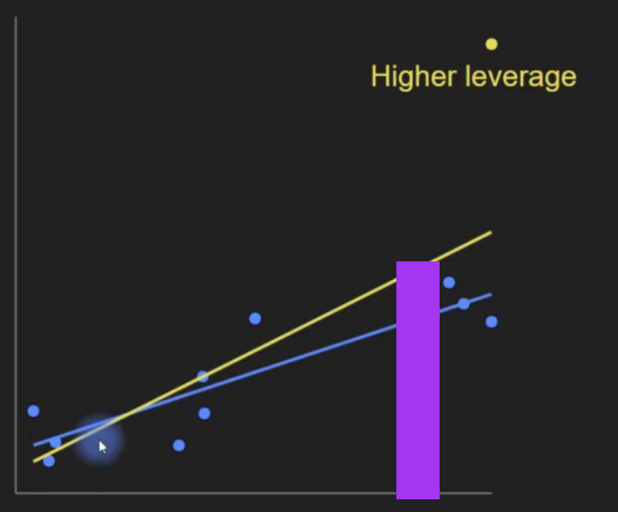 - 이 상황에서 이상치는 상대적으로 크게 영향을 주지 않고있다. -> 기울기에는 변화가 없기 때문 -> 로우 레버리지
