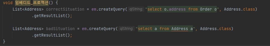 - SELECT m.address From Member m -> 임베디드 타입 프로젝션