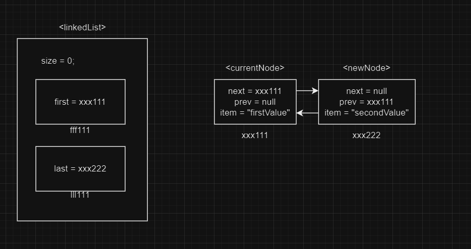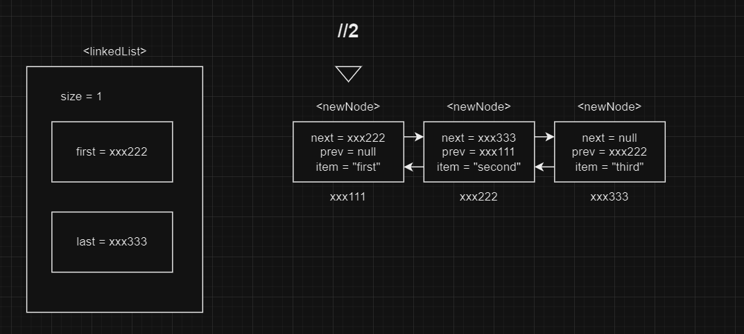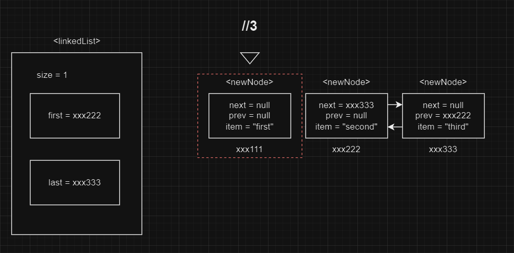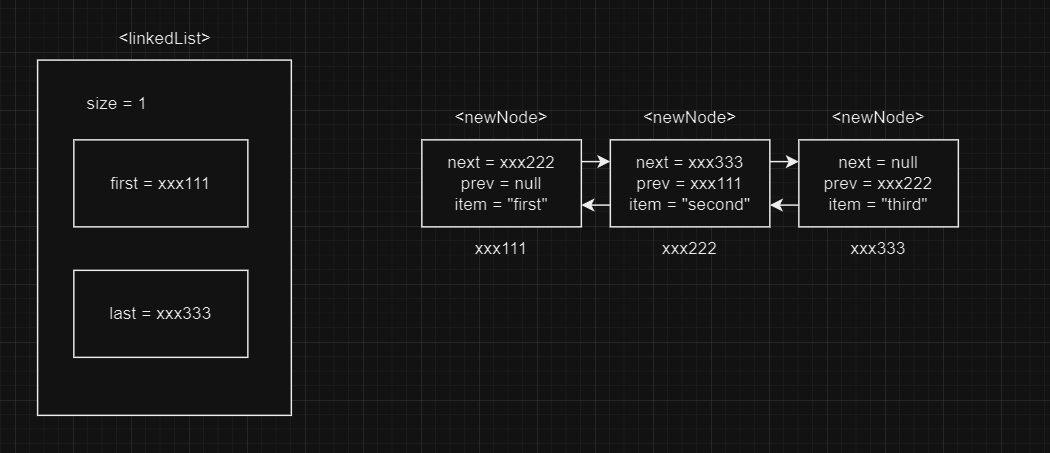 LinkedList의 인스턴스변수 는 대략적으로 이렇게 구성되어있다.