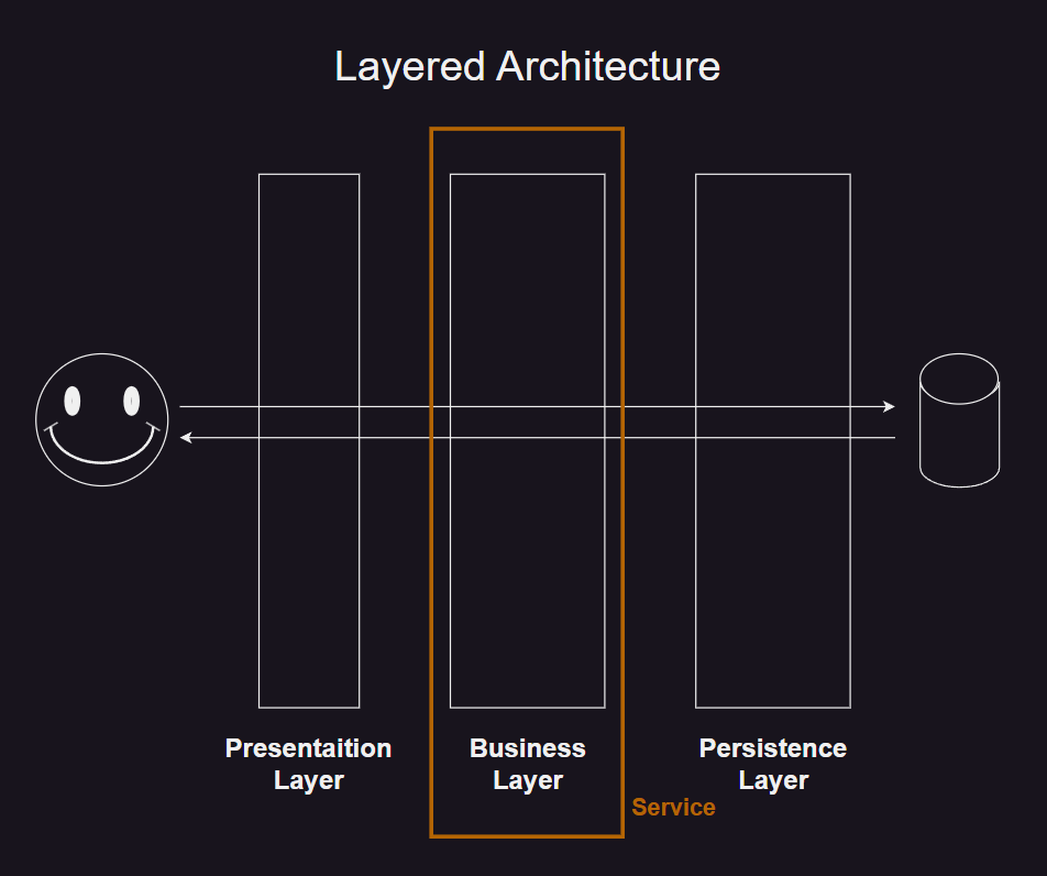 레이어드 아키텍쳐란, 아래와 같이 관심사를 3가지(혹은 4가지) 로 분류한 아키텍쳐를 의미한다.